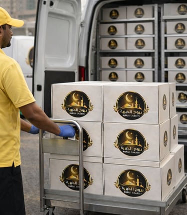 Volunteers distributing diverse iftar meals to pilgrims under the evening sky in Mecca.